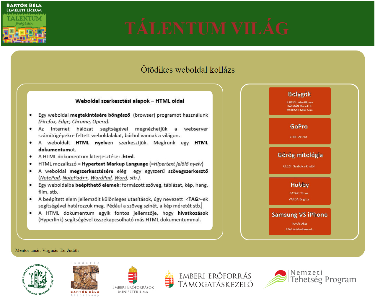 Kik voltak a mentorok? Albert Etelka, Păcurar Mária, Szilveszter Ibolya (matematika), Bartyik Zita és Tóth Kinga (természettudományok), Mauzer Erika és Virginás-Tar Judith (számítástechnika).