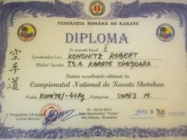 A március elsején, Râmnicu Vâlcean megszervezett Románia Shotokan nemzeti bajnokságon, Kohonitz-Turbók Róbert, iskolánk ötödik osztályos tanulója egyéni kumite probán ezüstérmes lett. A februári hónap is sikeres volt számára, a 16-án, Temesváron megszervezett Tamashyi kupán második, a 23-án Aradon megszervezett Banzai nemzetközi kupán negyedik helyezést ért el.