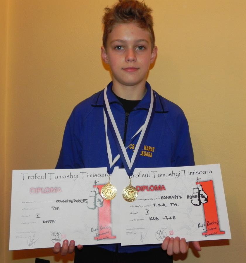 Pe 7 februarie la Cupa Tamashyi de la Giroc, Robi a castigat atat proba Kata cat si Kumite si a fost premiat cu medalia de aur.Felicitari!
