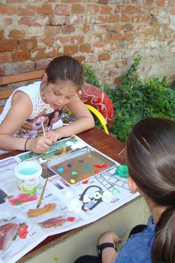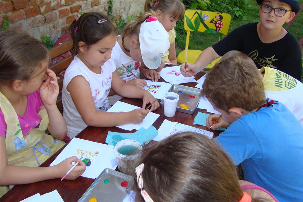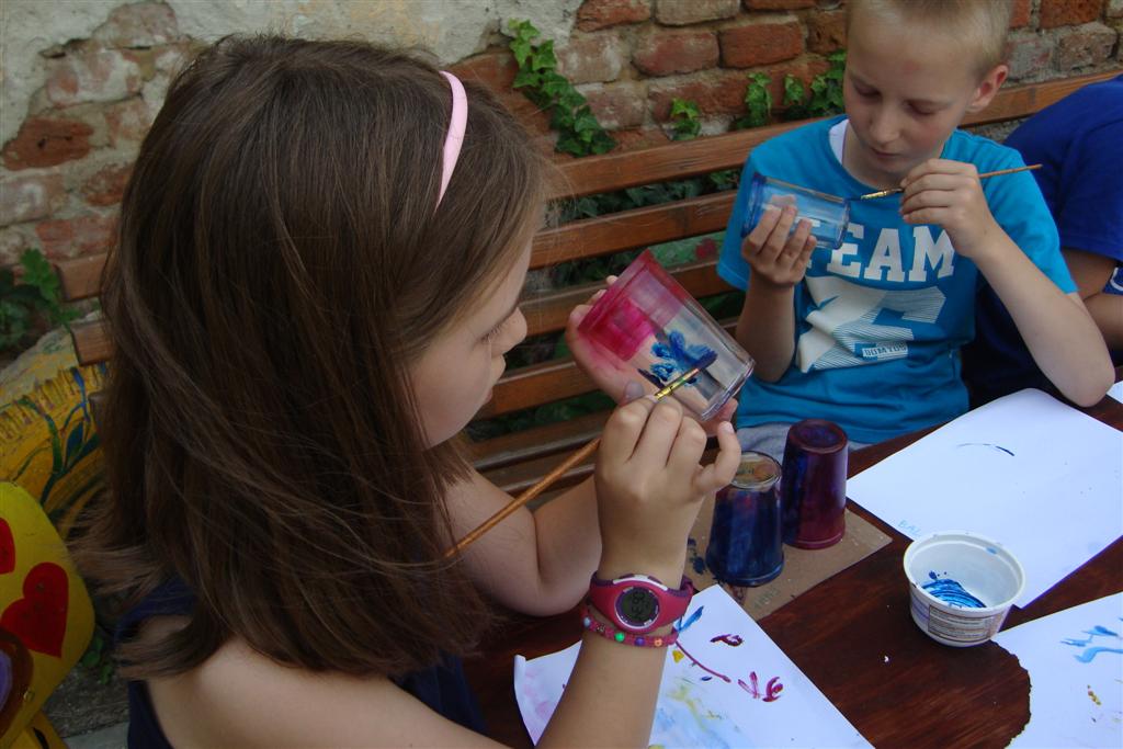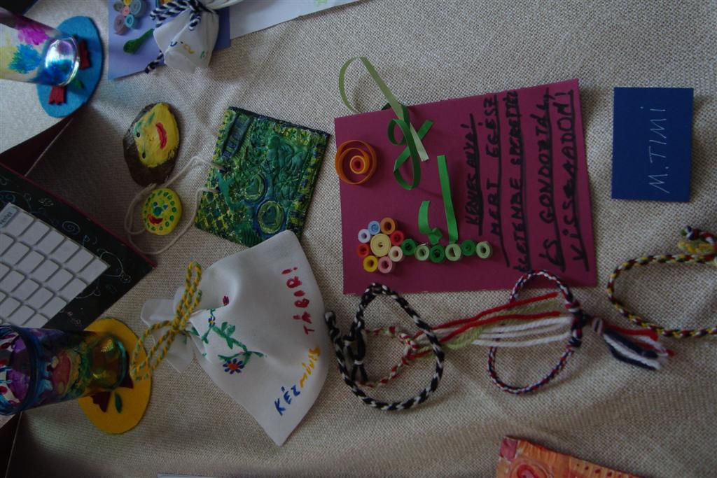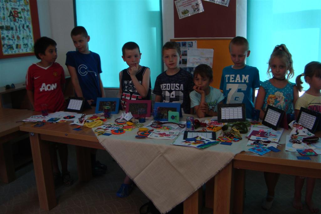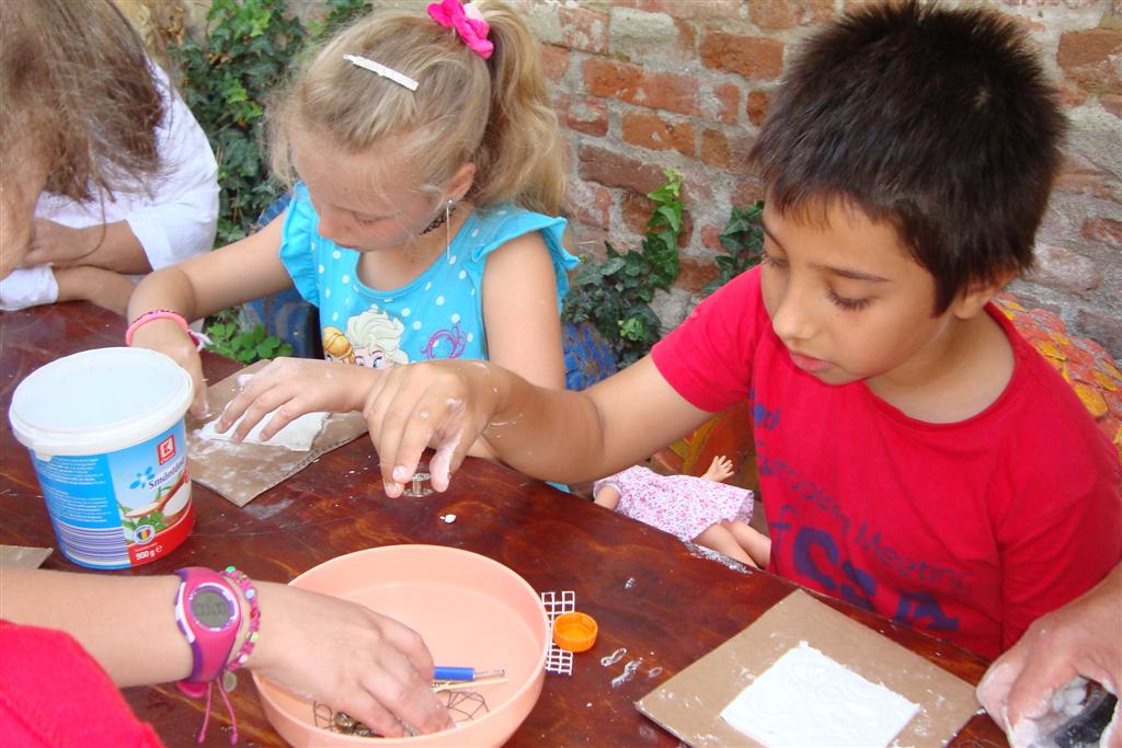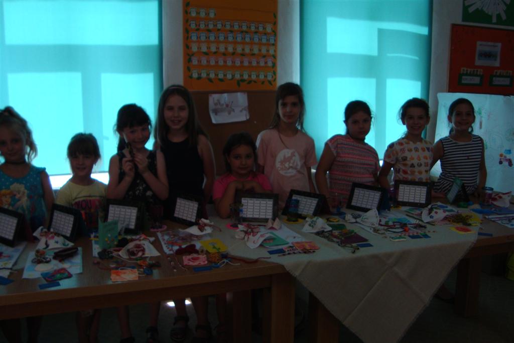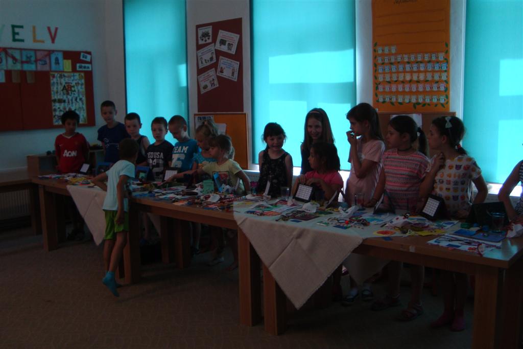 A vakáció első hetében népes gyereksereg alkotott és ügyeskedett a kézműves bejárótábor tevékenységein, volt aki nem először vett részt ilyen táborban, de voltak újoncok is. A tevékenységek szerepelt: barátságkarperec fonás, ujjbáb szövés, agyagozás, karc-rajz készítés, textilfestés, gyöngyfűzés, faldísz készítés és festés, quillingezés. Készítettünk filcből poháralátétet, valamint egyedi mintázatú üvegfestéssel díszítettünk poharat is mellé. A heti alkotó tevékenység a már megszokott táborvégi kiállítással zárult, amit a szülők is megtekinthettek.