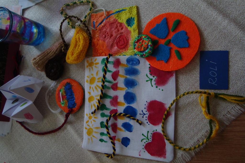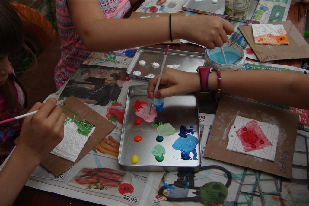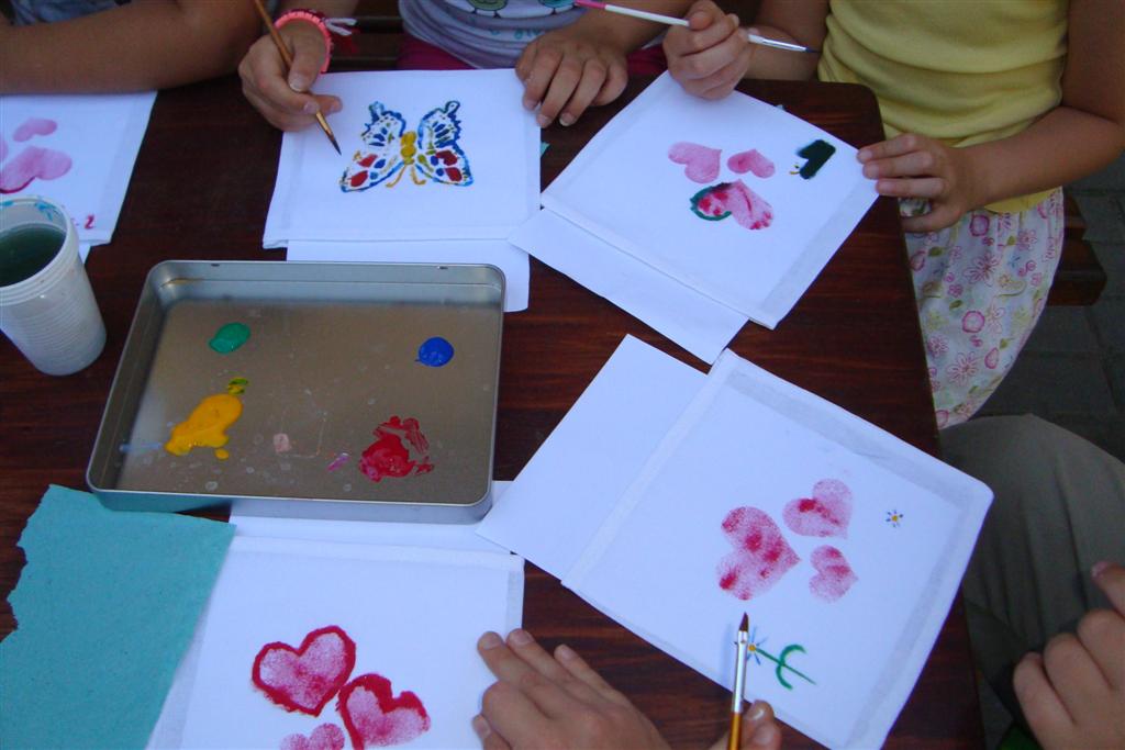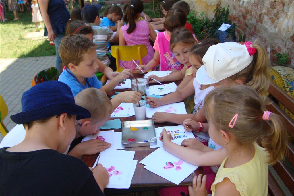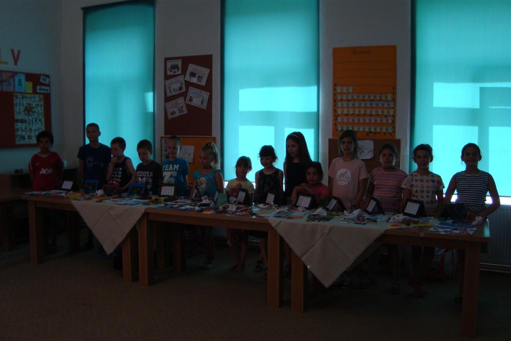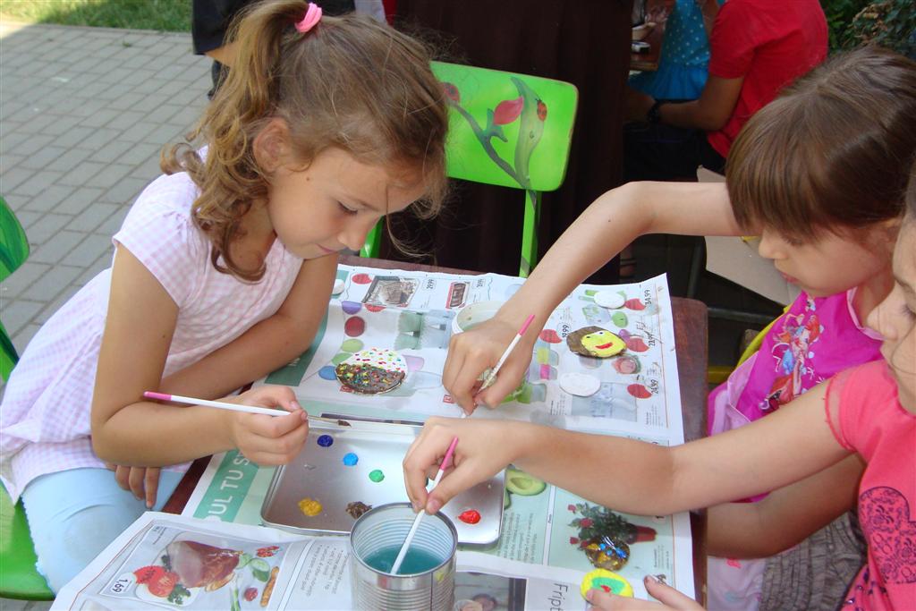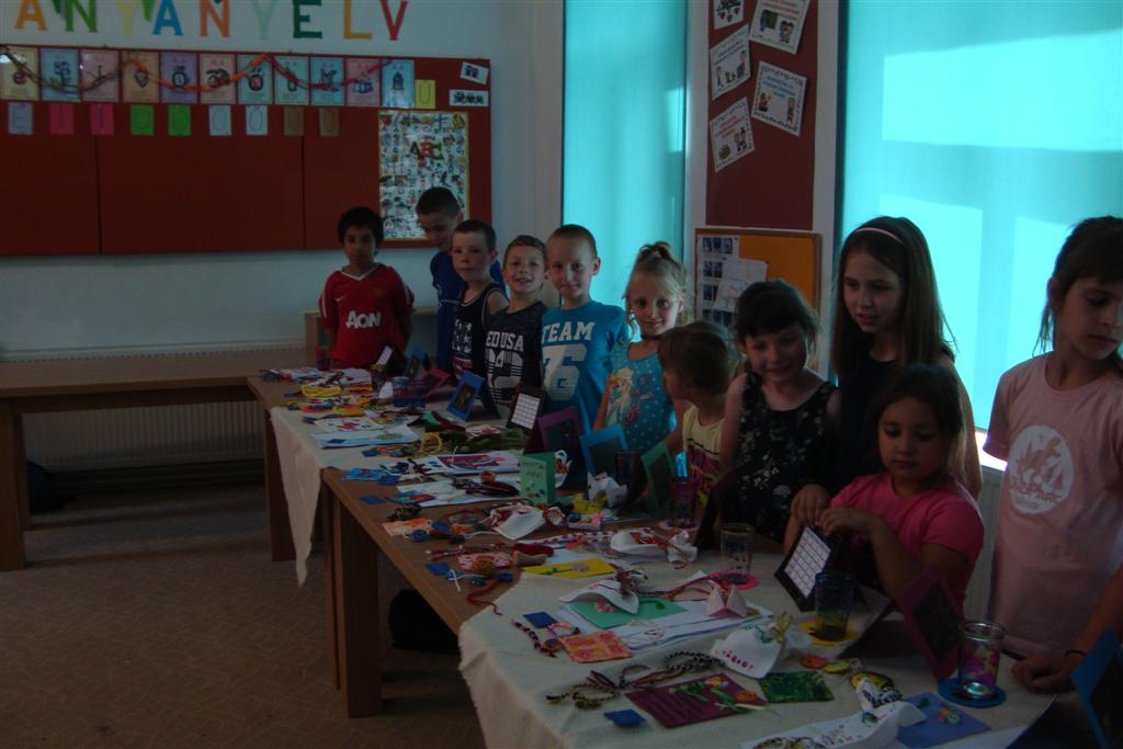 A vakáció első hetében népes gyereksereg alkotott és ügyeskedett a kézműves bejárótábor tevékenységein, volt aki nem először vett részt ilyen táborban, de voltak újoncok is. A tevékenységek szerepelt: barátságkarperec fonás, ujjbáb szövés, agyagozás, karc-rajz készítés, textilfestés, gyöngyfűzés, faldísz készítés és festés, quillingezés. Készítettünk filcből poháralátétet, valamint egyedi mintázatú üvegfestéssel díszítettünk poharat is mellé. A heti alkotó tevékenység a már megszokott táborvégi kiállítással zárult, amit a szülők is megtekinthettek.