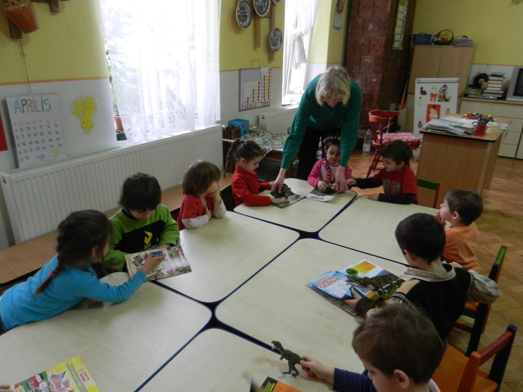 A gyermekek egy rövid előadást hallgattak meg a dinoszauruszokról, majd műanyag dinoszaurusz maketteket figyeltek meg, melyek alapján azonosították a folyóiratokban szereplő dinókat. A Hogyan éltek a dinoszauruszok?című rajzfilm megtekintése után a gyerekek néhány mozgásos jatékot játszottak.
